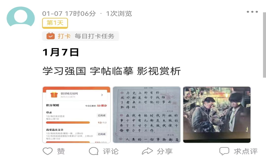 在这四周里,做了许许多多的事情,一天一页字帖,对于家务每天都在做自己力所能及的事情……其中,对于学习强国app的学习,已经积累了一千多分,在积累成长总结积分的过程中,看到了了解了国家以及世界各地正在发生或者已经发生的事情。了解到攻坚扶贫中的艰辛与不易,这项工作的成功是各个行业,各个地区团结互助,是每个人的想法碰撞,是每个人的四处奔波,是每个人对党的信仰。