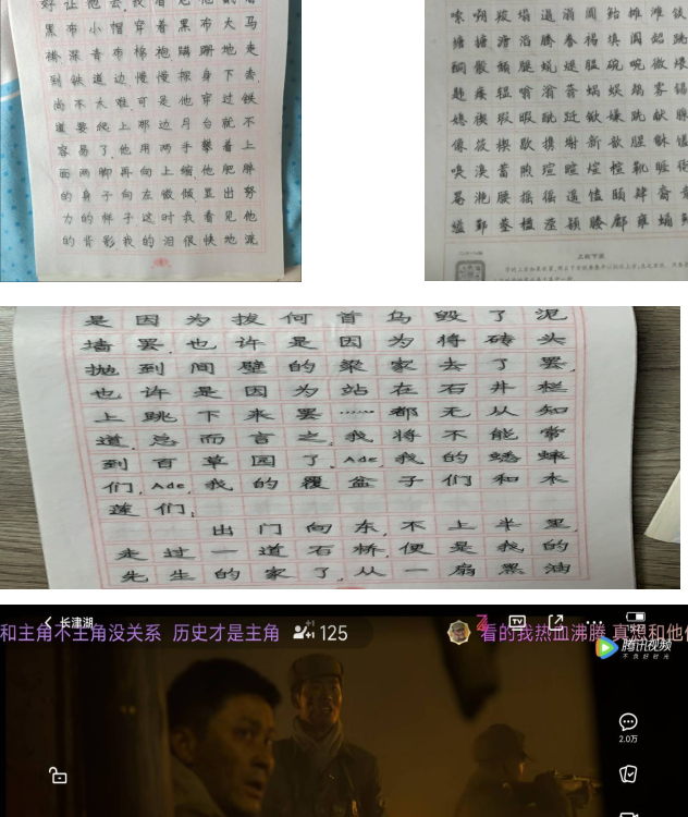 经过第四周的第四学期实践学习,机电系第060组电气211,212,213班;孙诗博,赵强,赵靖含,冯时除完成日常的打卡、锻炼,字帖以及任务外,还进行了红色影视作品赏析活动。