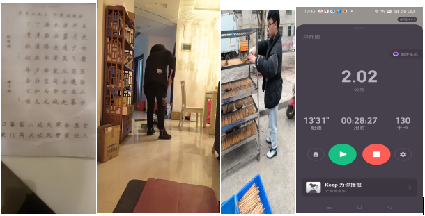 在本周内,我组每个成员积极完成各项任务。孙鹏博,甘宇航,刘英楠,宋士成同学每天的字帖,学习强国任务都能按时完成,效率很高,本周,甘宇航同学在家里对社会实践采取了积极措施,为镇上的社区的食堂就行了志愿者服务工作,具体做了洗碗筷、擦座椅等工作得到社区的高度认可;孙鹏博同学坚持每天练字帖和学习强国,肉眼可见字写得越来越好;刘英楠同学经常减轻家里的负担,天天洗碗和扫地,为家里提供了不少的劳动力;宋士成每天坚持学习强国,对学校的任务已经快要完成,对寒假学习提高觉悟有着高度的重视;大家对于本周的任务有着很高的积极性。