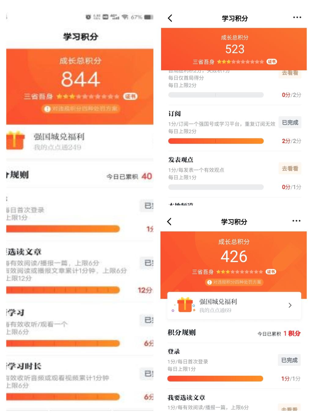 经过一段时间学习强国的学习,我们对学习强国越发感兴趣,它不仅可以使我们知道国家的外交和发展的故事更是有好玩的游戏,四人pk二人pk进行知识抢答学习,经过一段时间的学习刘献泽同学的积分已经达到800,曲俊达同学和赵才选同学仍然需要继续努力,希望取得更高的积分。