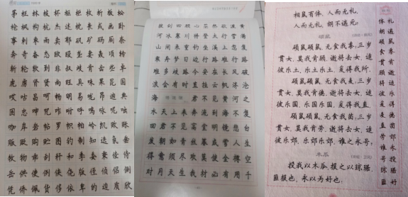 随着科技的发展,时代的进步,汉字书写越来越少,提笔忘字的现象已经不在少数。为了提高书写能力,培养我们的耐心,学校鼓励我们每天描字帖,我们机电工程系第253组李文婵、李东明、郑博文三位同学,积极响应学校号召,坚持每天字帖临摹。
