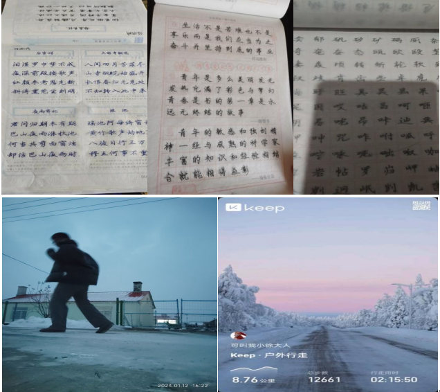 各成员每天按时进行字帖的练习、学习强国的学习以及小程序打卡,同时也在室内外进行适当的身体锻炼。通过网络及实体书进行知识的阅读与积累,并写下观后感,以保证每天知识的汲取。