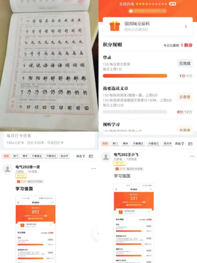 机电系57组第四学期谭一清,唐俊,王小飞第四周期间,除完成了每日的字帖、学习强国打卡任务外,并且还进行了读书交流,以及感恩劳动。