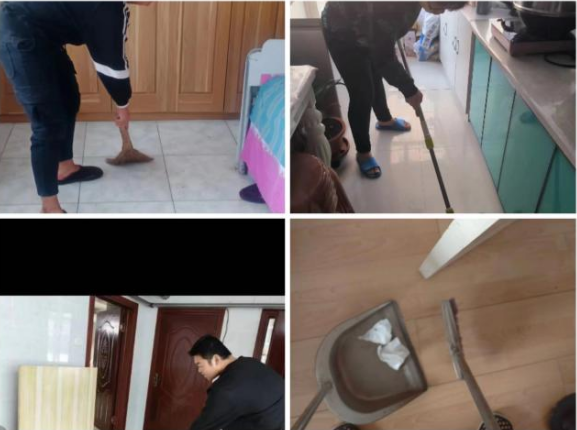 本次活动分为扫地和拖地两个任务,需要同学们在家里准备好扫把和拖把,选择自己想做的家务劳动,本次活动刘立强同学和姜健同学选择了扫地,肖利超和付伟奇同学选择拖地。拖地之前需先扫地,因为在地板不干净时拖地,地板上会留下水印。在拖地的水里,可加一些辅料(比如洗衣液、食盐、小苏打),能够有效的去油去污渍,还可以防止地板留下水印。