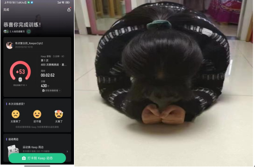史文广同学用app进行锻炼记录,任菲菲同学选择平板支撑,平板支撑不仅可增加身体的平衡力和稳定性,还可美化背部线条。韩顺婷同学选择在校期间学习的少年拳来带动全身肌肉参与运动。谭俊杰同学选择俯卧撑,俯卧撑不仅能强壮骨骼和肌肉,还能起改善血管弹性、增加四肢血液流动。