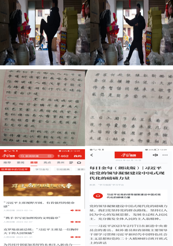 锻炼结束是练习字帖的最佳时间,此时此刻的意识可以高度集中,练字的效果可以说是事半功倍,提升自身的“汉字书写能力”是我们在第四学期期间必不可少的必修任务之一。强国学习是培养大学生拥有一个好的思想观、价值观、世界观的途径,通过学习,我们可以更好的了解国家政策、世界格局、历史文化、乡村建设等多种多样的知识,丰富我们的认知,开阔我们的眼界,展望我们的未来,提高了我们的“政治鉴别能力”。