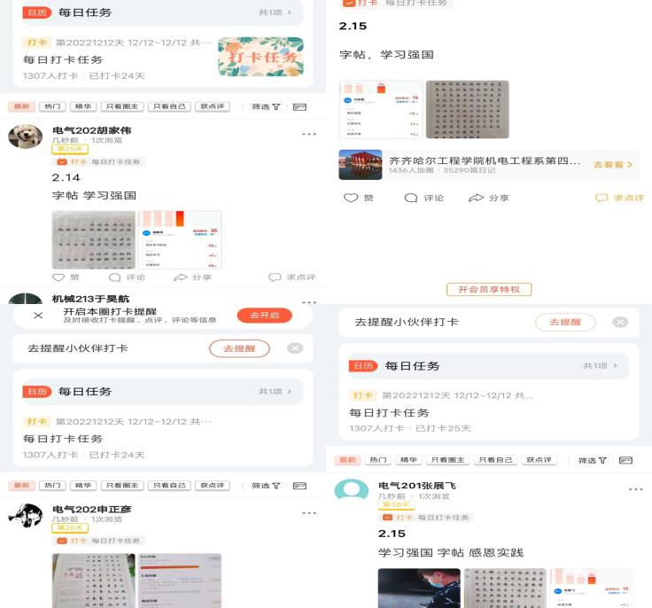 机电系91组第五周实践从2月13日开始,到2月19日结束,在此期间,组内的成员各自完成了字帖临摹和学习强国等任务,且及时向组长截图打卡。