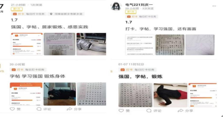 党员学长协助生涯老师对学生们进行指导。首先学生们对可选项目(三选二)进行了选择,其中三人选择健身锻炼和影视赏析,一人选择健康锻炼和才艺展示,五个必选项目分别为:字帖临摹、读书交流、志愿服务、母校回访以及劳动实践。其次学生们利用学习强国这个平台进行学习和答题,通过合理利用学习强国,认真开展自学,既能提高党性修养,又可以增加学习内涵,使学生们全方位了解国家,了解党组织的一种有效方式。最后学生们每日都会用小程序打卡,68组同学每天都按时完成,积极坚持到了最后。