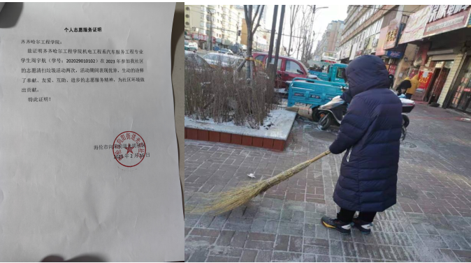 为响应学校号召,实地践行第四学期任务,2023年2月21日机电系241组周宇航同学在海伦市向阳街道光明社区参加志愿服务活动。