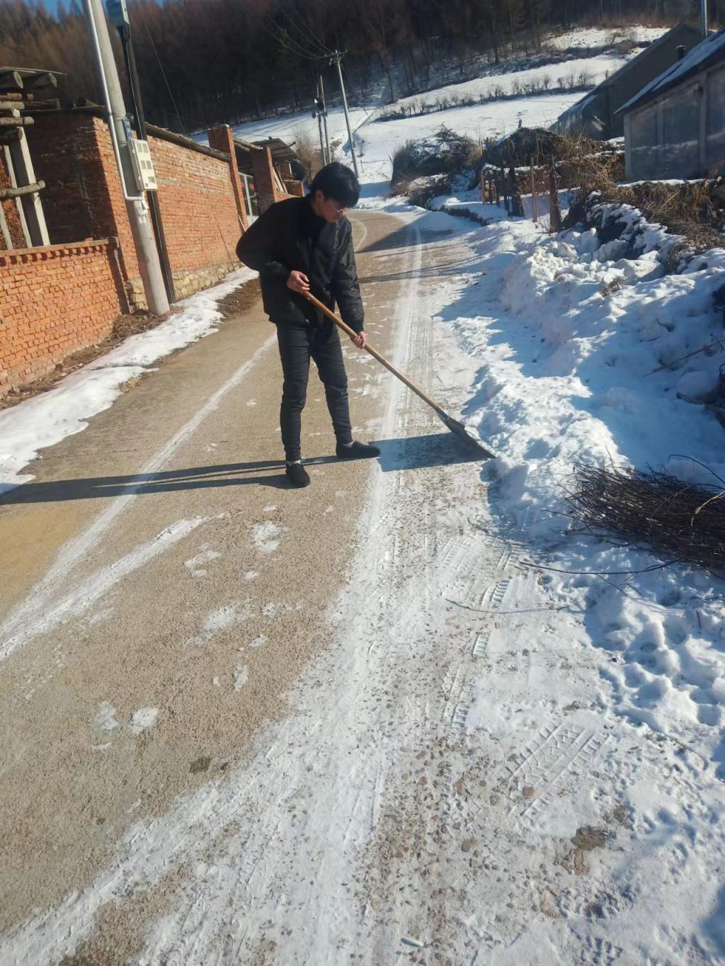 本周我实践的主要内容是帮助村民清理路面上的积雪以及清理路面上的冰层。因为天气不断变化的原因,本地区连续下了几天大雪,给村民的出行带来了不便。我的主要任务是先清理路面上的积雪,再清理积雪下面的冰层。经过几日昼夜不停的雨雪天气,积雪堆积得很厚,清理起来不是很容易,经过一段时间的努力,表面上的积雪被清理干净,露出了积雪下面的冰层。冰层才是最难清理的,由于天气的不断变化,冰层结得特别厚,不能用塑料工具清理,只能用铁锹进行清理。冰层虽不像积雪那么厚,但清理起来还是非常麻烦的。终于经过大家的不懈坚持,洁净的路面呈现在大家的眼前。