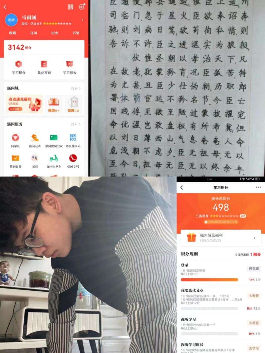 本周我们小组进行了学习强国、字帖和居家锻炼活动,我们小组的组员都在积极的完成第四学期任务,并享受第四学期生活。
