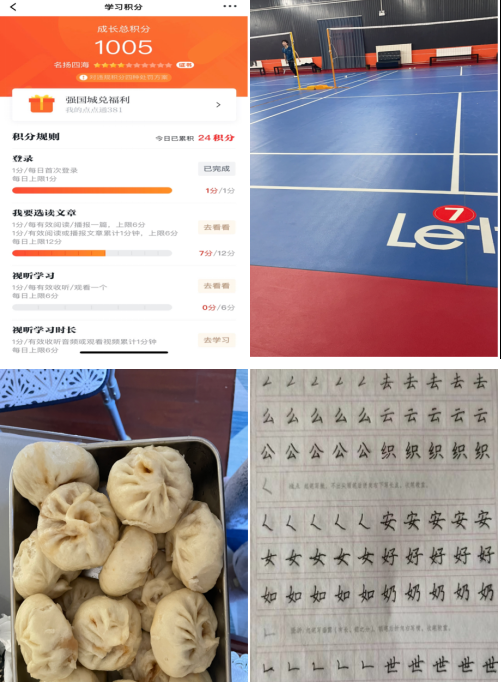 此外,本组成员都按时保量的完成学习强国的学习任务和字帖临摹。通过学习强国,我们不仅能学习到最新的时事政治、方针政策、国际动态,更能学习党的历史。通过学习“学习强国”,不断提升了综合能力,锤炼了党性修养。字帖临摹也增强了我们汉字书写能力,这也学校相当重视的“三五能力”之一。