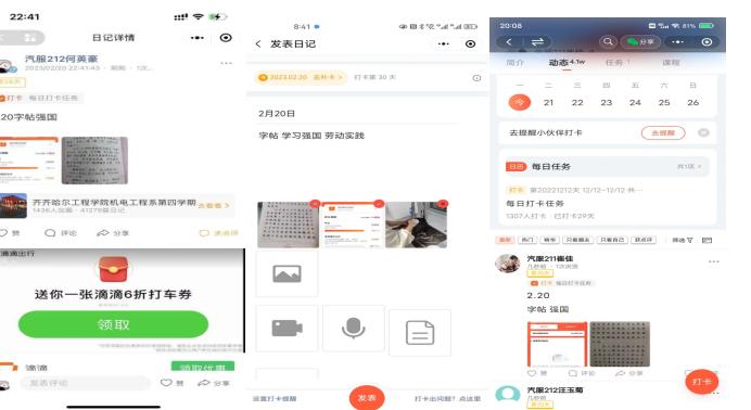 通过每天的打卡,可以看出我们每一个人都在努力,在进步,在向着努力的目标前进,告诉我们只懂得纸上谈兵是远远不及的,以后的人生旅途是漫长的,为了锻炼自己成为一名合格的、对社会有用的人才。