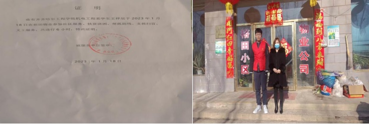 在2023年1月18日和2月16日,作为齐齐哈尔工程学院机电系的一员,我响应齐齐哈尔工程学院第四学期志愿服务的号召,加入社区的志愿服务活动。