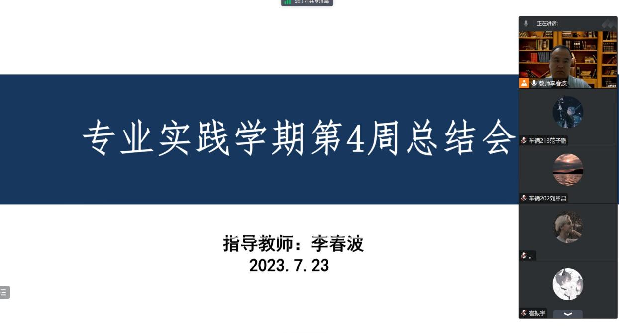2023年7月23日晚,李春波老师以腾讯会议形式召开实践学期第四周的总结会。所指导的车辆学生参会。