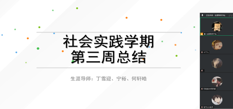 本次会议生涯导师宁裕进行开场致辞,简要介绍本次会议的目的和意义及出席老师:生涯导师何轩皓,丁雪迎。并强调社会实践学期的重要性,以及生涯导师在学生实践过程中的指导和支持作用。